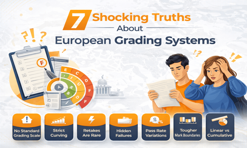 European grading systems can be confusing for international students due to varying scales, conversion methods, and evaluation standards across countries. This blog reveals 7 shocking truths about European grading systems, including differences between ECTS grades, percentage systems, GPA conversions, and strict marking policies. Learn how grades are calculated, what “passing” really means, and how to accurately convert European scores for global admissions or job applications.